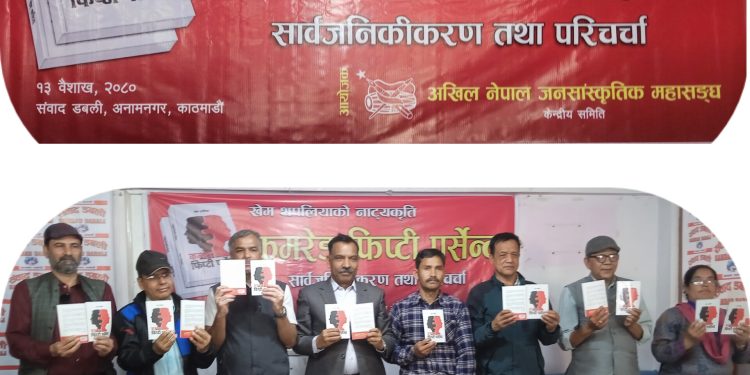 खेम थपलियाकाे नाट्यकृति रहेको पुस्तक कमरेड फिप्टी पर्सेन्ट सार्वजनिक गरिएको छ। काठमाडौँको अनामनगरस्थित संवाद डबलीमा अखिल नेपाल जनसांस्कृतिक महासंघकाे आयोजनामा उक्त पुस्तक विमाेचण गरिएको हो। कार्यक्रममा पुस्तककाे महत्वलाई लिएर विविध वक्ताहरुले आफ्नो धारणा राखेका थिए।