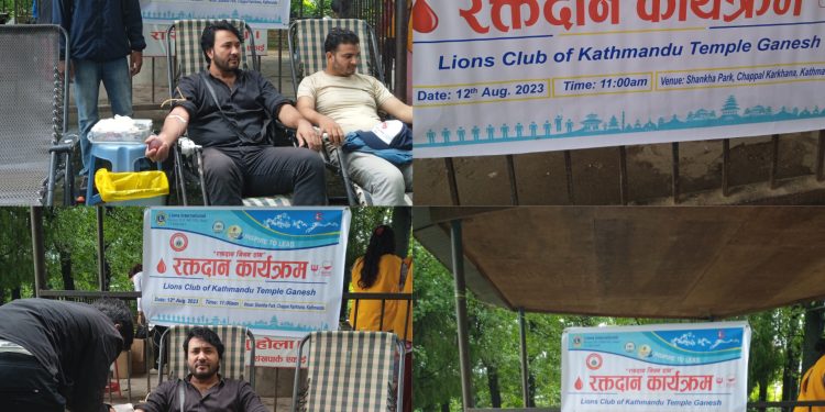 २०८० साउन २७, काठमाडौँ । काठमाडौंको चप्पल कारखाना स्थित शंखपार्कमा बृहत रक्तदान कार्यक्रम भएको छ । लायन्स क्लब अफ टेम्पल गणेशको आयोजनामा ग्राण्डी अन्तर्राष्ट्रिय अस्पताल काठमाडौंको समन्वयमा साउन २७ गते शनिबार सो कार्यक्रम भएको हो । कार्यक्रम बिहान ११:०० बजेदेखि बेलुका ४:०० बजेसम्म सञ्चालन हुने समाजसेवी तथा सञ्चारकर्मी राजन थापाले जानकारी दिएका छन।