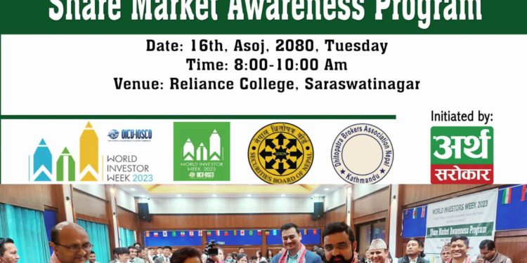 काठमाडौं । “विश्व लगानीकर्ता सप्ताह २०२३” को अवसरमा धितोपत्र ब्रोकर्स एशोसिएसन नेपालको आयोजना तथा अर्थसरोकारको पहलमा शेयर बजार सचेतना कार्यक्रम सम्पन्न गरिएको छ । कार्यक्रम रिलायन्स कलेज, सरस्वतीनगर, काठमाडौँमा आयोजना गरिएको हो । कार्यक्रमको उद्घाटन प्रमुख अतिथिको रुपमा उपस्थित सफल महिला लगानीकर्ताको रुपमा चिरपरिचत लगानीकर्ता श्री दुर्गा तिवारी रिजालज्यूले विरुवामा पानी हालेर गर्नुभएको थियो । यस्तै गरी कार्यक्रममा उपस्थित सबैलाई स्वागत मन्तव्य रिलायन्स एजुकेसन नेटवर्कका अध्यक्ष रबिन्द्रजङ्ग थापाले व्यक्त गर्नुभएको थियो ।
