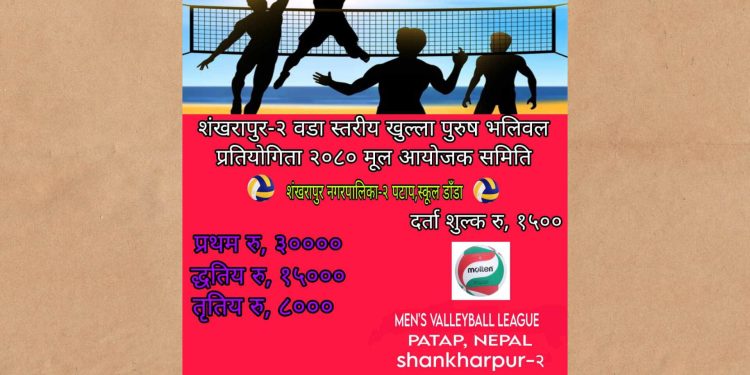 २४ कात्तिक , काठमाडौँ । काठमाडौँ जिल्लाको एतिहासिक एवम् पर्यटकीय नगरी शंखरापुर नगरपालिकाको  वडा न.२ पटाप स्थित खुल्ला पुरुष भलिबल प्रतियोगिता २०८० हुने भएको छ। अयोजक समितिले बताए अनुसार-प्रतियोगिता-यहि कात्तिक २७ र २८ गते हुने भएको छ। खेलमा ईच्छुक खेलाडीहरु जाे काेहीले पनि भाग लिन सकिनेछन्। खेलमा सहभागी जनाउन दर्ता गर्नुपर्नेछ भने शुल्क रु, १५०० बुझाउन पर्नेछ। दर्ताकाे लागि पटाप स्थित स्कुल डाँडामा सम्पर्क गर्न सकिन्छ। साथै विजेतालाई आकर्षक नगद सहितकाे पुरस्कार राशीकाे व्यवस्था गरिएकाे छ। पुरस्कार राशीमा – प्रथम रु,३०००० दुतिय रु. १५००० तृतिय रु, ८००० रहेको छ। सन्तोष प्रसाद तिवारी।
