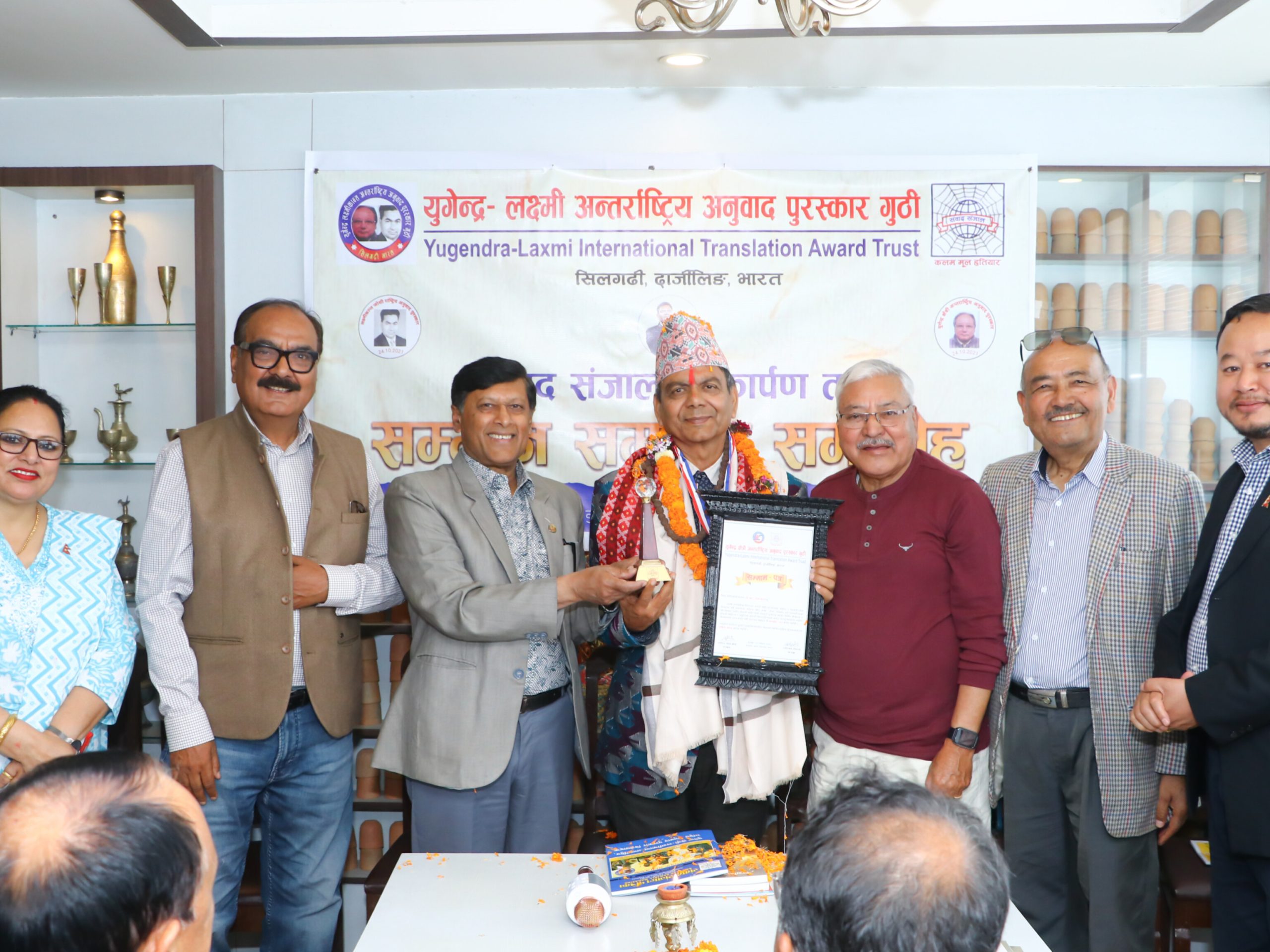 २९ चैत, काठमाडौं। विश्व कीर्तिमानी गीतकार एवं उपन्यासकार डा.डी.आर.उपाध्याय सम्मानित हुनुभएको छ । युगेन्द्र–लक्ष्मीकान्त अन्तर्राष्ट्रिय अनुवाद पुरस्कार गुठी, सिलगढी, भारतले बुधबार काठमाडौंमा एक विशेष समारोहबीच उहाँलाई सम्मान अर्पण गरेको हो ।कार्यक्रमका प्रमुख अतिथि वरिष्ठ कलाकार मदनदास श्रेष्ठले उपाध्यायलाई सम्मान अर्पण गर्नु भएको थियो । सर्जक उपाध्यायलाई सम्मानपत्र, मेडल, मायाको चिनो, दोसल्ला, टोपी ,  रुद्राक्ष/फूलको माला र टीका तथा फूल वर्षासहित सम्मान गरिएको थियो ।