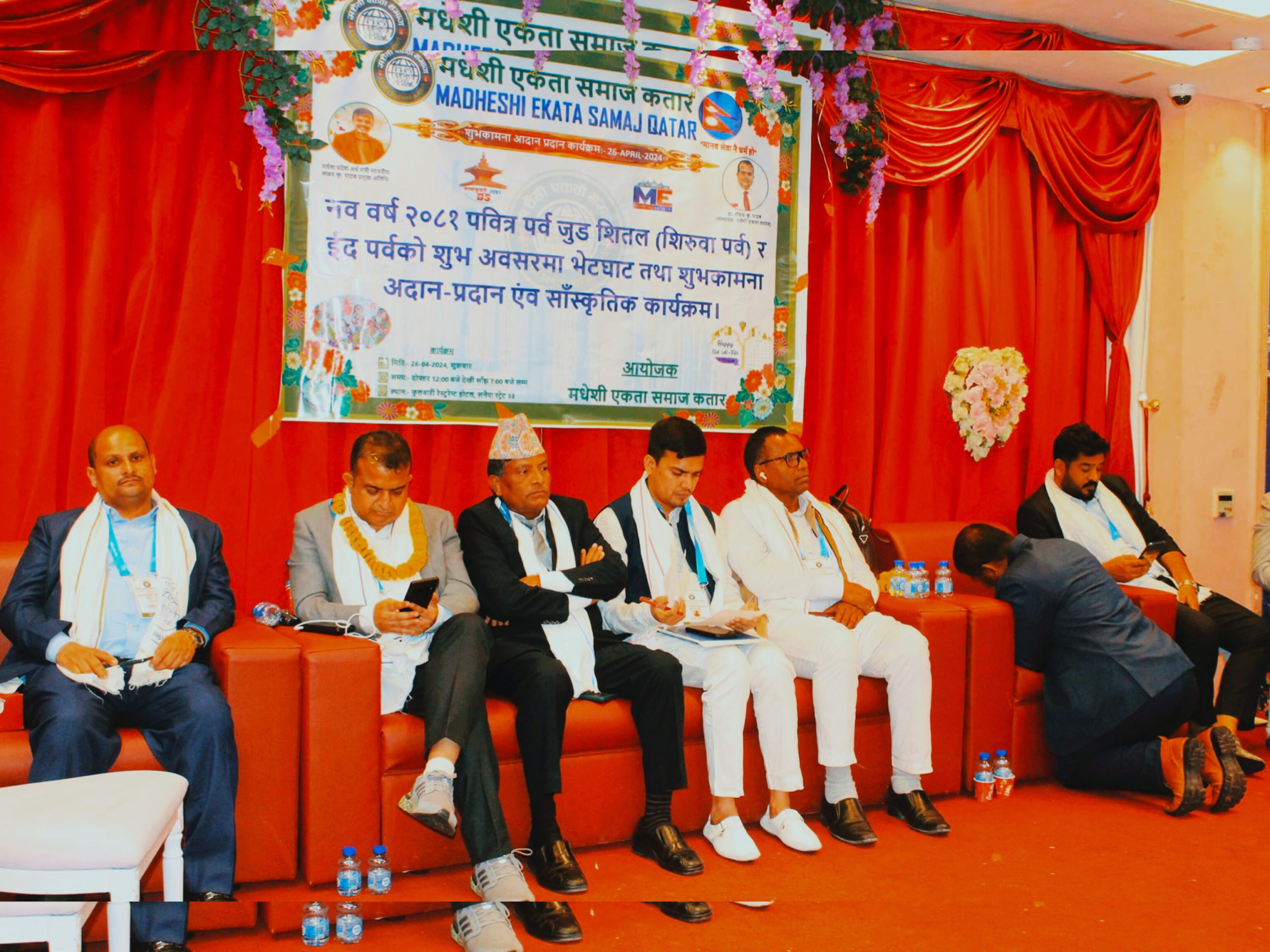 वैशाख १६, काठमाडौं । मधेशी एकता समाजको कतार शाखाले यस वर्षको नयाँ वर्ष, जुडशीतल तथा ईद पर्वको अवसरमा शुभकामना आदानप्रदान तथा बृहत् सांस्कृतिक कार्यक्रम आयोजना गरेको छ ।बैशाख १५ गते शुक्रबारको दिन समाजको कतार शाखाले दोहाको सनैया स्थित फुलवारी रेस्टुरेन्टको सभाहलमा भव्य कार्यक्रम आयोजना गरेको हो । कतार शाखाका अध्यक्ष शिव कुमार महतोको अध्यक्षतामा सम्पन्न कार्यक्रममा मधेश प्रदेशका अर्थमन्त्री संजय कुमार यादव प्रमुख अतिथिको रुपमा उपस्थित हुनुहुन्थ्यो भने समाजका संस्थापक डा. रवीन्द्र कुमार यादव र कतारस्थित नेपाली दूतावासका कार्यवाहक राजदूत कुमार राई विशिष्ट अतिथिको रुपमा सहभागी हुनुहुन्थ्यो । कार्यक्रममा एन.आर .एनए.का पदाधिकारी तथा कतारस्थित विभिन्न नेपाली संघसंस्थाका प्रतिनिधिका साथै पत्रकार एवं बुद्धि-जीविहरुको पनि बाक्लो उपस्थिति थियो । शुभकामना मन्तव्य राख्नुहुँदै प्रमुख अतिथि एवं मधेश प्रदेशका अर्थमन्त्री यादवले नेपालको वर्तमान राजनीति र मधेशको पिछडिएको अवस्था एवं विकासका बारेमा आफ्नो धारणा राख्नुभएको थियो ।