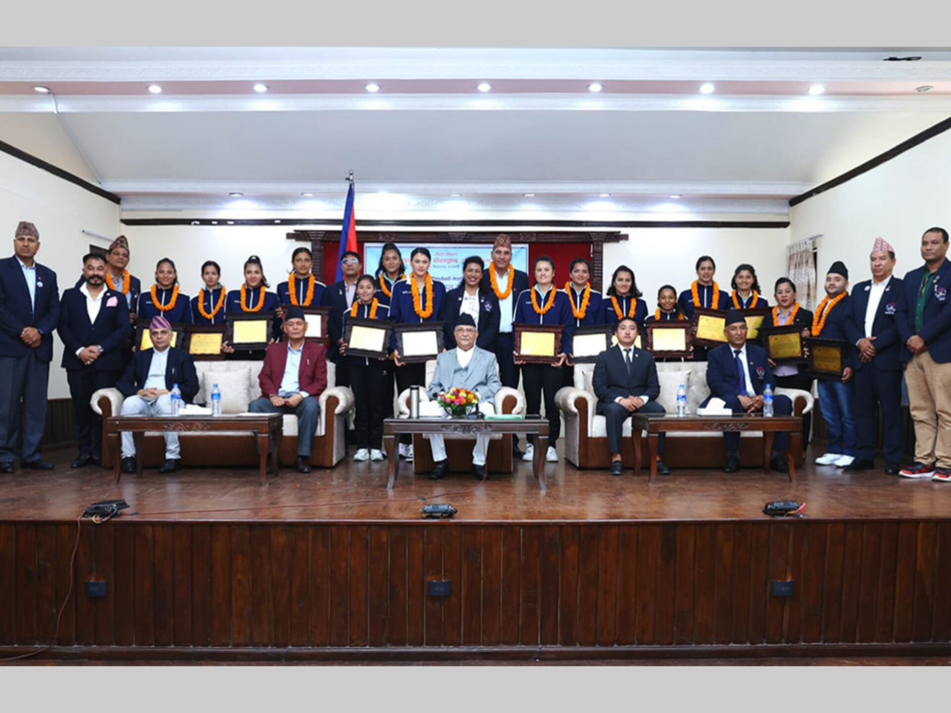 प्रधानमन्त्री निवास, बालुवाटारमा प्रधानमन्त्री ओलीले महिला भलिबल टोलीका कप्तान अरुणा शाहीसहित १४ खेलाडी, मुख्य प्रशिक्षक जगदीशप्रसाद भट्ट, सहायक प्रशिक्षक भरत यादव, व्यवस्थापक निलमसिंह बज्राचार्य र फिजियो लोकेन्द्र कुँवरलाई पुरस्कार वितरण गरेका थिए । खेलाडीलाई जनही ३ लाख रुपैयाँ, मुख्य प्रशिक्षक भट्टलाई दुई लाख रुपैयाँ तथा सहायक प्रशिक्षक यादव, व्यवस्थापक बज्राचार्यलाई र फिजियो कुँवरलाई जनही एक लाख २० हजार राशिसहित पुरस्कार प्रदान गरिएको थियो ।गत साउन १७ गतेदेखि २३ गतेसम्म काठमाडौँमा भएको उक्त खेलमा नेपालले उत्कृष्ट प्रदर्शनसहित दोस्रो स्थान हासिल गरेको थियो । मन्त्रिपरिषद्को गत साउन ३१ गते बसेको बैठकले सहभागी खेलाडी, प्रशिक्षलगायतलाई गरी कूल रु ४७ लाख ६० हजार पुरस्कार दिने निर्णय गरेको थियो।