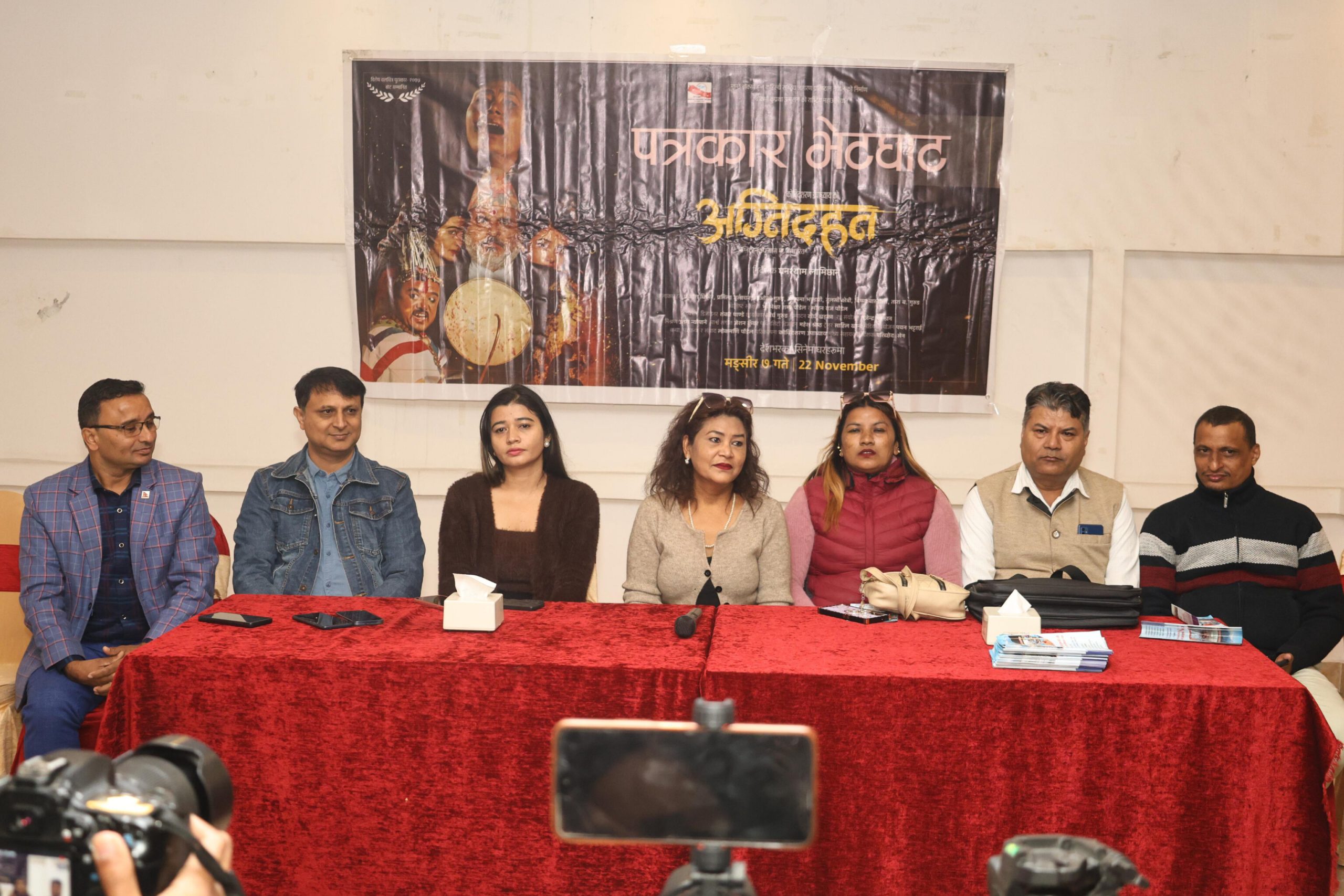 काठमाडौं । यही शुक्रबारबाट रिलिज हुने फिल्म ‘अग्निदहन’ले सोमबार पत्रकार तथा सञ्चारकर्मीसँग अन्तरक्रिया गर्दै फिल्मबारे जानकारी दिएको छ । साहित्यकार तथा पत्रकार लोकमणि पौडेलको उपन्यास ‘अग्नीदहन’मा आधारित रहेर तयार पारिएको फिल्मले रिलिजको छेकोमा पत्रकारसँग अन्तरक्रिया गरेको हो । फिल्मका प्रस्तुतकर्ता तथा परिकल्पनाकार कोविदशरण उपाध्यायले बोक्सी प्रथा उन्मुलन गराउन आफुहरुले फिल्म बनाएको बताए । ‘समाजमा बोक्सी छैन भन्ने सन्देश दिन हामीले फिल्म बनाएका हौं । बोक्सीका नाममा अझै पनि महिलामाथि अत्याचार भइरहेका घटना बेला बेलामा सार्वजनिक भइरहन्छन् । हामी फिल्ममार्फत बोक्सी हुँदैन र महिलालाई बोक्सीका नाममा अत्याचार गरिनुहुन्न भन्ने सन्देश दिन चाहन्छौं’, उनले भने ।