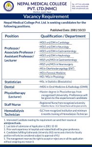 कलेजले अस्पताल तथा सम्बन्धित विषयमा अनुभव हासिल गरेकाहरुलाई प्राथमिकता दिने जनाएको छ । इच्छुक उम्मेदवारले आफ्नो ब्यक्तिगत बायोडाटा इमेल मार्फत पठाउनु पर्नेछ । योग्यता पुगेका उम्मेदवारलाई कलेज प्रशासनले अन्तरवार्ताका लागि बोलाउने छ ।