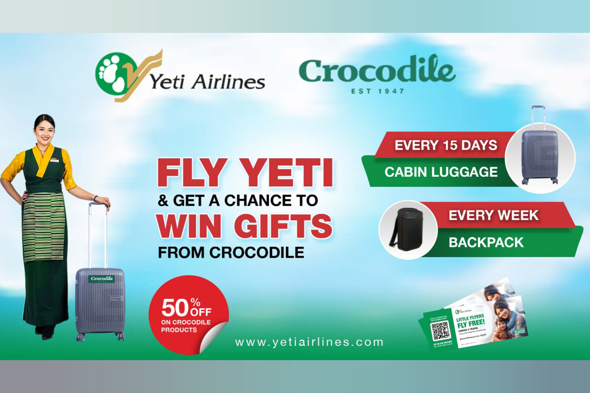 ११ फागुन ,काठमाडौं । यती एअरलाइन्समा उडान भर्ने यात्रुहरुले क्रोकोडाईल लगेज तथा ब्यागप्याकमा हात खालि नजाने उपहार पाउने भएका छन् । फेब्रुअरी, मार्च र अप्रिल महिनामा यती एअरलाइन्स बाट यात्रा गर्ने यात्रुहरुले क्रोकोडाईल लगेजको खरिदमा ५० प्रतिशत सम्मको छुट प्राप्त गर्नेछन् ।