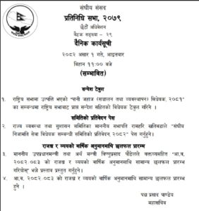 काठमाडौं । प्रतिनिधिसभाको बैठक बस्दै सभा बिहान ११ बजे बस्ने गरी समय निर्धारण भएको सुचनापत्र मा जनाएको छ । आजको बैठकमा उपप्रधानमन्त्री एवम् अर्थमन्त्री विष्णुप्रसाद पौडेलले वक्तव्य सहित ‘आर्थिक वर्ष २०८२–८३ को राजश्व र व्ययको वार्षिक अनुमान माथि सामान्य छलफल गरियोस्’ भन्ने प्रस्ताव पेस गर्ने र सो प्रस्तावमाथि छलफल हुने सम्भावित कार्यसूची छ । राज्य व्यवस्था तथा सुशासन समितिका सभापति रामहरि खतिवडाले ‘संघीय निजामति सेवा विधेयक सम्बन्धी समितिको प्रतिवेदन, २०८२’ पेस गर्नुहुने कार्यसूची छ । सुची-: