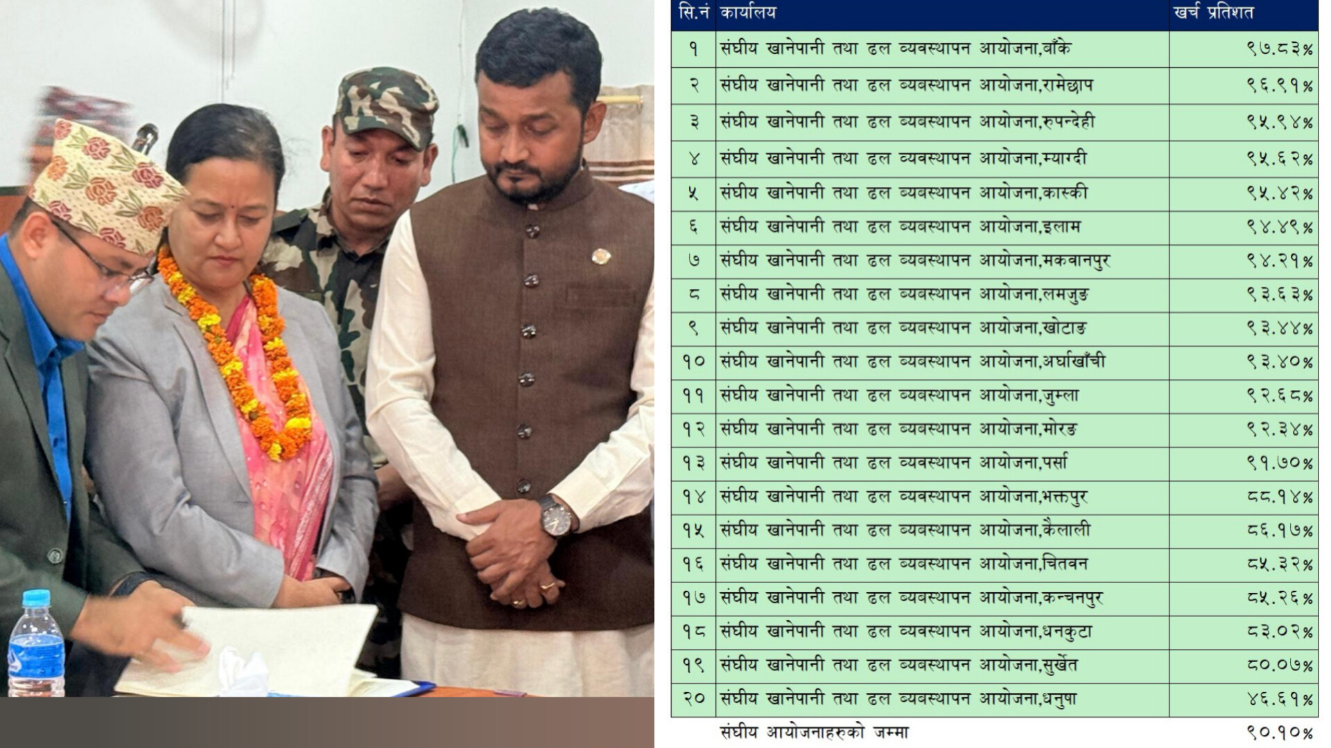 विभागको अद्यावधिक विवरणअनुसार संघीय खानेपानी तथा ढल व्यवस्थापन आयोजना बाँकेले ९७ दशमलब ८३, रामेछापले ९६ दशमलब ९१ प्रतिशत, रपन्देहीले ९५ दशमलब ९४, म्याग्दीले ९५ दशमलब ६२ तथा कास्कीलेले ९५ दशमलब ४२ प्रतिशत प्रगति हासिल गरी उत्कृष्ट परेका छन् । समयमै योजना कार्यान्वयन, अनुगमन तथा अन्तरसंस्थागत समन्वयले गर्दा विभागले उल्लेख्य सफलता हात पार्न सफल भएको विभागका महानिर्देशक इन्जिनियर रामकुमार श्रेष्ठले जानकारी दिनुभयो । उहाँले भन्नुभयो, “विभागको वित्तीय प्रगती ९० प्रतिशत पुगेको छ । यो विभाग सहित मन्त्रालयका लागि नै ठूलो उपलब्धि हो । रकमान्तरमा सहयोग गर्ने खानेपानी मन्त्रालय, अर्थ मन्त्रालय लगायत सबैमा विभाग अनुग्रहित छ ।”