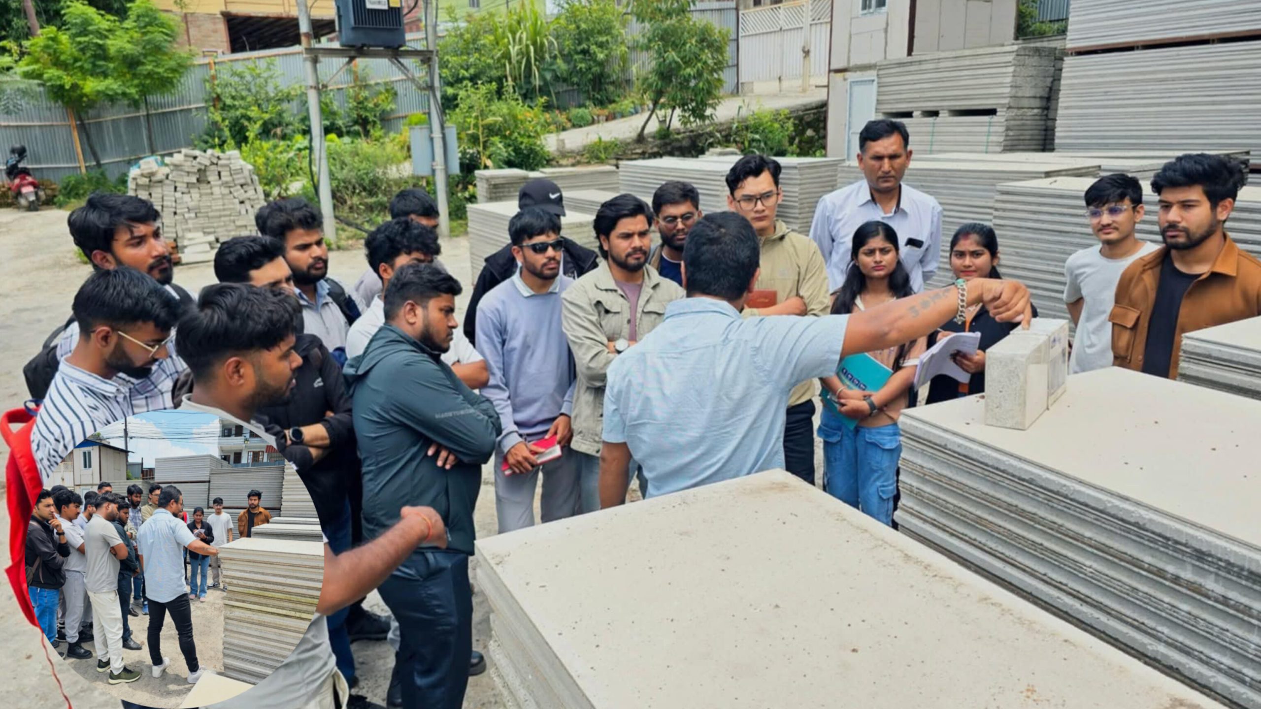 The visiting students observed the composition, manufacturing process, salient features, engineering properties, and diverse applications of EPS-cement-based sandwich panels in real-world construction.
