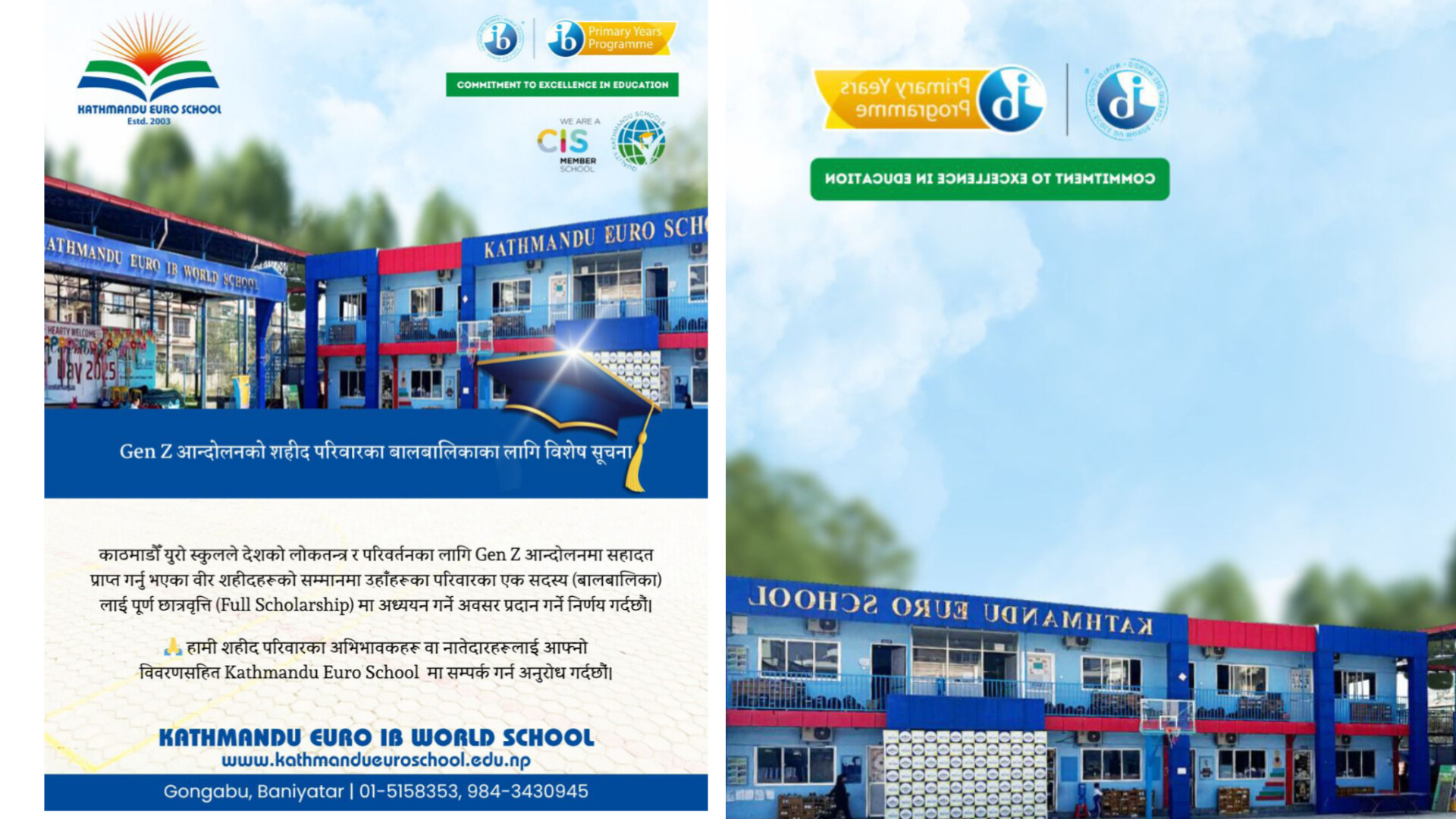 काठमाडौं । गोंगबु–बनियाटारस्थित काठमाडौं युरो आईबी वर्ल्ड स्कूलले परिवर्तनका लागि ज्यान आहुति दिएका जेनजी आन्दोलनका सहिद परिवारका बालबालिकालाई पूर्ण छात्रवृत्तिमा अध्ययनको अवसर प्रदान गर्ने घोषणा गरेको छ । विद्यालयले जेनजी आन्दोलनमा सहादत प्राप्त वीर सहिदहरूको सम्मानमा उनीहरूका सन्तानमध्ये एक जनालाई पूर्ण छात्रवृत्तिमा अध्ययन गर्ने अवसर दिने निर्णय गरेको हो । विद्यालयका अध्यक्ष प्रमोद पाण्डेका अनुसार विद्यालयको सामाजिक उत्तरदायित्व र सहिदहरूको बलिदानप्रतिको सम्मानस्वरूप यस्तो घोषणा गरिएको हो । शिक्षा नै सशक्तिकरणको माध्यम हो।लोकतन्त्रका लागि ज्यान आहुति दिने सहिदहरूको सपना साकार पार्ने हाम्रो सानो प्रयास हो, अध्यक्ष पाण्डेले भने ।