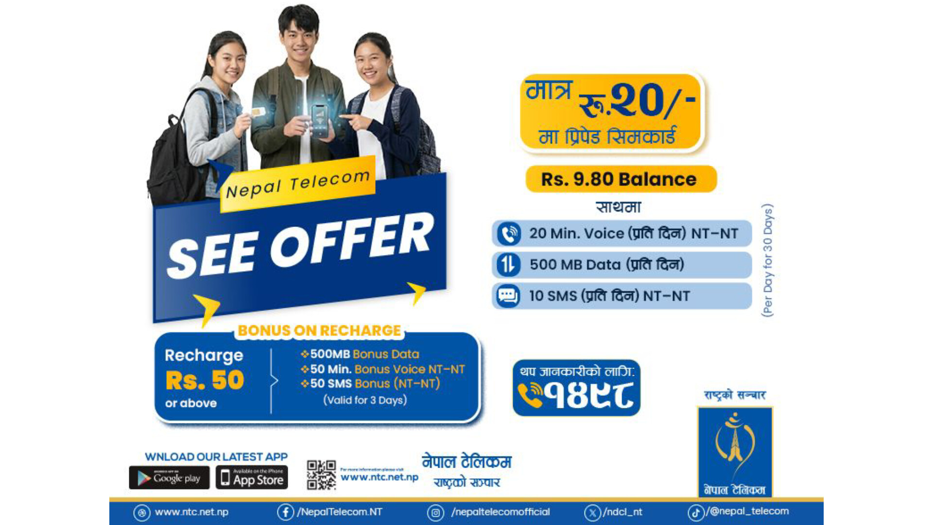 काठमाडौं । नेपाल टेलिकम ले २०८२ सालको माध्यमिक शिक्षा परीक्षा (एसईई) मा सहभागी विद्यार्थीहरूका लागि विशेष “एसईई अफर २०८२” सार्वजनिक गरेको छ। कम्पनीका अनुसार उक्त अफर आज चैत २६ गतेदेखि सुरु भई आगामी २०८३ असार २६ गतेसम्म लागू रहनेछ। यस अफरअन्तर्गत नयाँ सिमकार्ड लिने विद्यार्थीहरूले मात्र नभई पहिलेदेखि नेपाल टेलिकमको सिम प्रयोग गरिरहेका परीक्षार्थीहरूले पनि सोही नम्बरमा सुविधा प्राप्त गर्न सक्नेछन्।